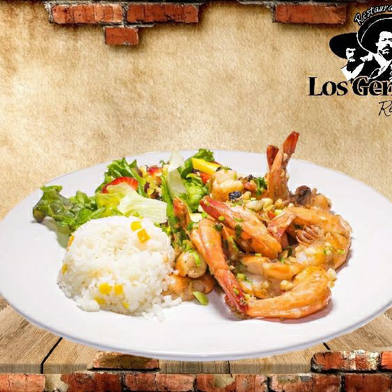 Camarones bañados en salsa diabla a base de chipotle, acompañado de arroz y aguacate.