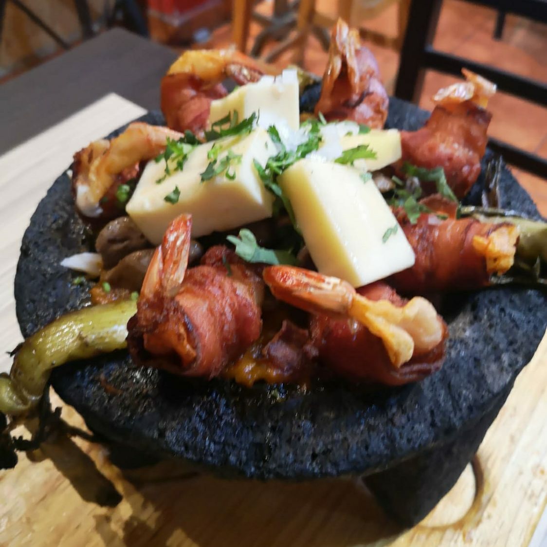 Para 2 personas. Combinación de camarones envueltos (en tocino rellenos de jamon y queso), con Arrachera en salsita de molcajete con guarnicion de queso, cebolla y cilantro.