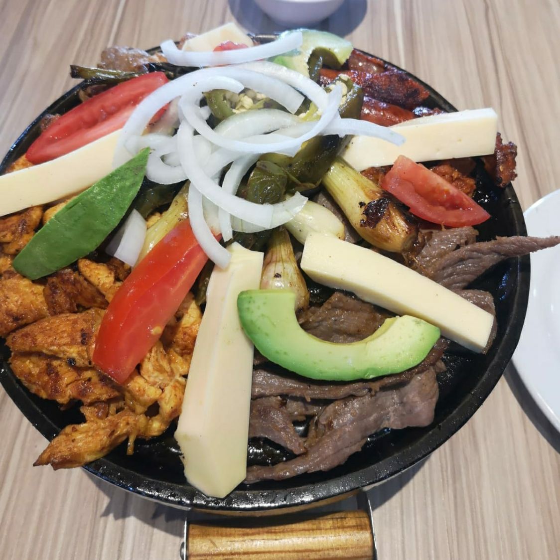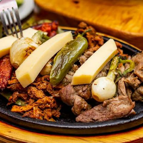 250gr De arrachera, 180gr de pechuga de pollo, 100gr de chorizo español, 180gr de bisteck de cerdo adobado, 100gr de chistorra, nopales, queso y chiles toreados, ideal para 3 o 4 personas.