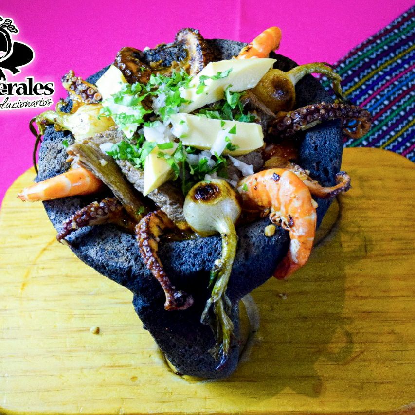 Para 2 personas, camarón, pulpo y arrachera en salsa de molcajete con nopales, cebollita y queso.