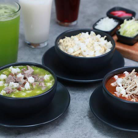 Incluye sus guarniciones: chicharrón, chile verde, cebolla picada, rábano, romanita, aguacate, tostadas, orégano, crema, limón