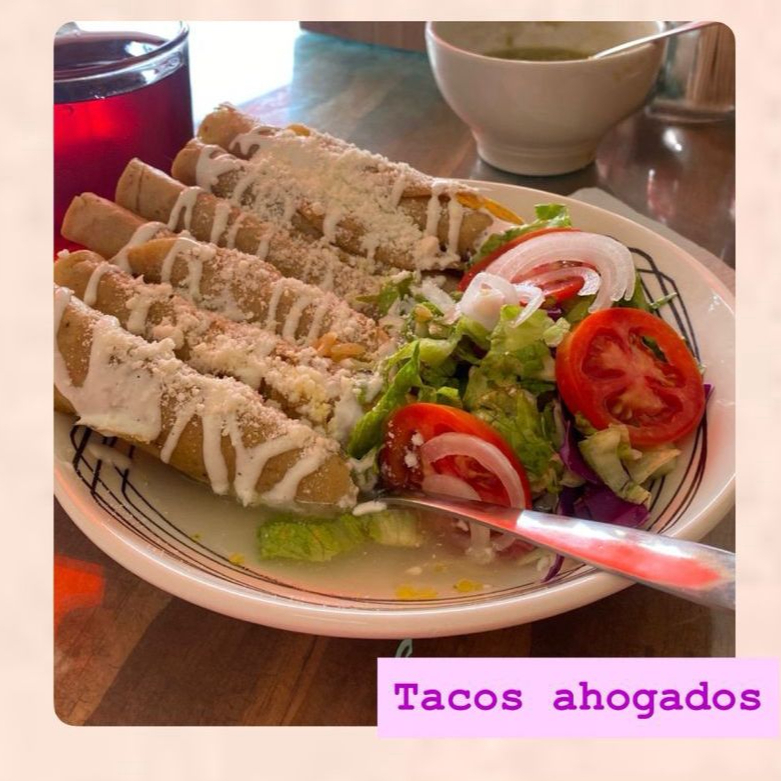 5 Piezas de tacos dorados rellenos de pollo deshebrado, bañados en salsa roja casera. Se sirven con un consomé de pollo caliente y acompañados de lechuga fresca, jitomate en cubos, cebolla picada, crema y queso rallado.