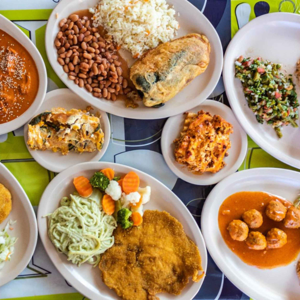 ARROZ , FRIJOLES , BISTEC A LA MEXICANA , TORTILLAS , SALSAS , ABANICO DE AGUACATE