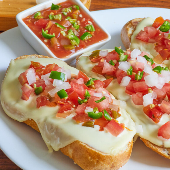 PAN TOSTADO , JITOMATE , CEBOLLA , LECHUGA , CHILE JALAPEÑO , AGUACATE , PICANTES