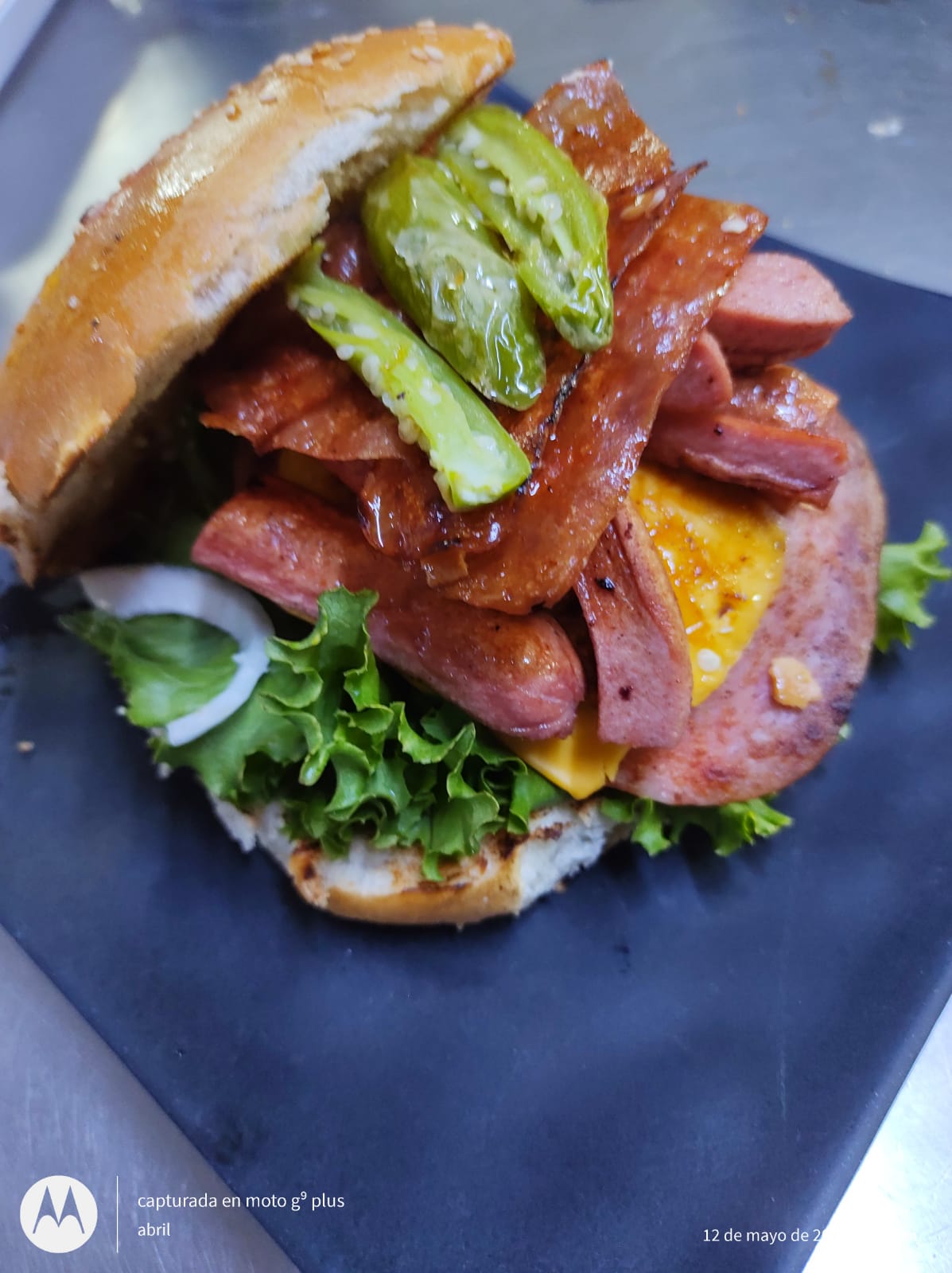 Hamburguesa Grande + Papas A la Francesa 100grs. aprox, Carne de la casa, queso Oaxaca, jamón, queso amarillo, salchicha, tocino, cebolla asada, chile toreado, lechuga y jitomate.