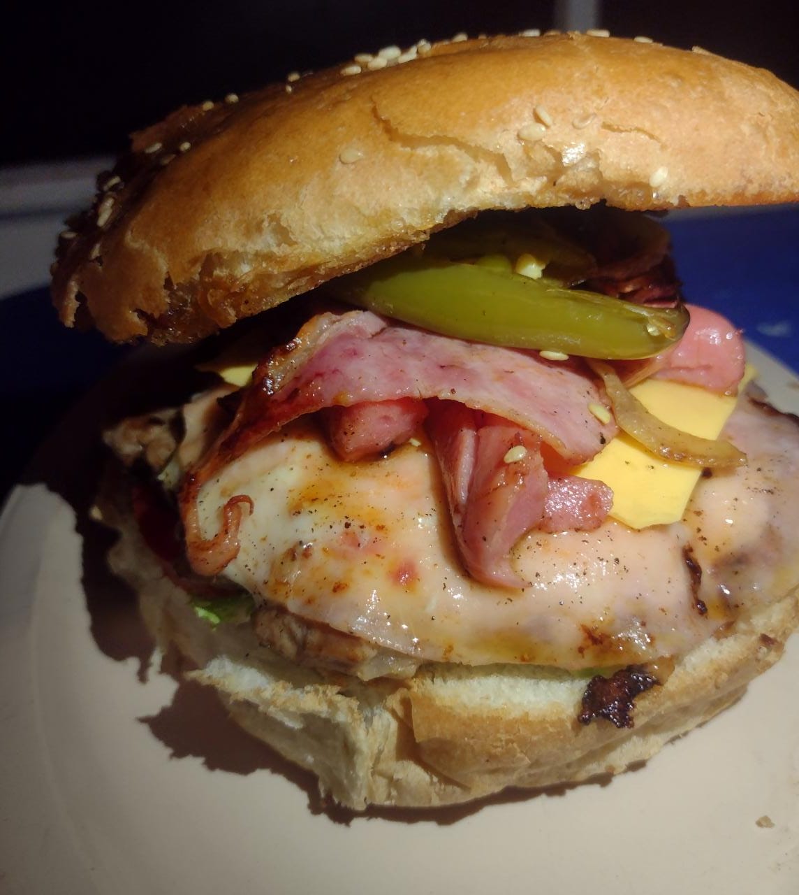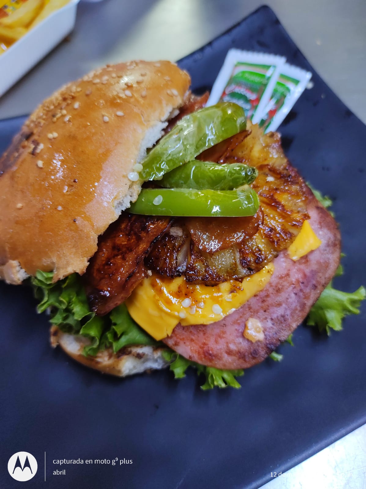 Hamburguesa Grande + Papas A la Francesa 100grs. aprox, Carne de la casa, queso Oaxaca, jamón, queso amarillo, piña, tocino, chile toreado, cebolla asada, lechuga y jitomate.
