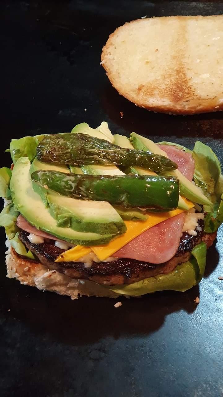 Hamburguesa Grande + Papas A la Francesa 100grs. aprox, Queso Oaxaca, jamón, queso amarillo, tocino, chile toreado, cebolla asada, lechuga y jitomate.