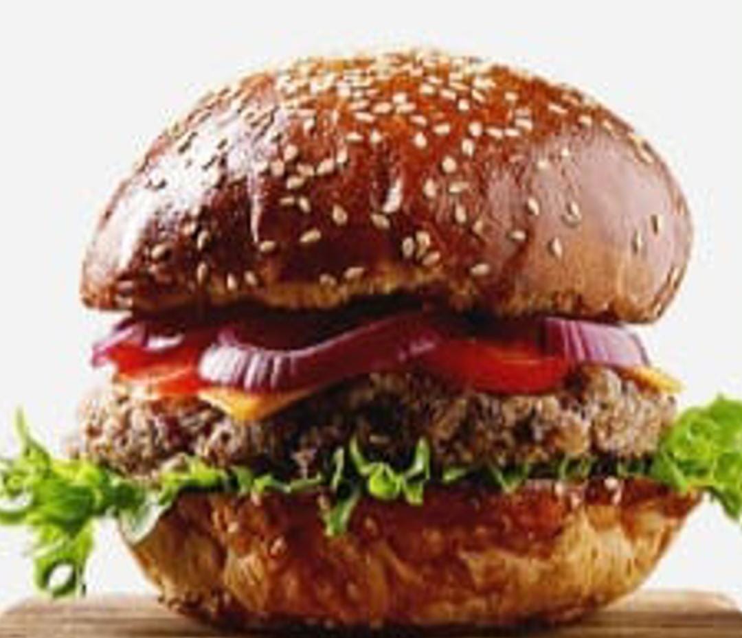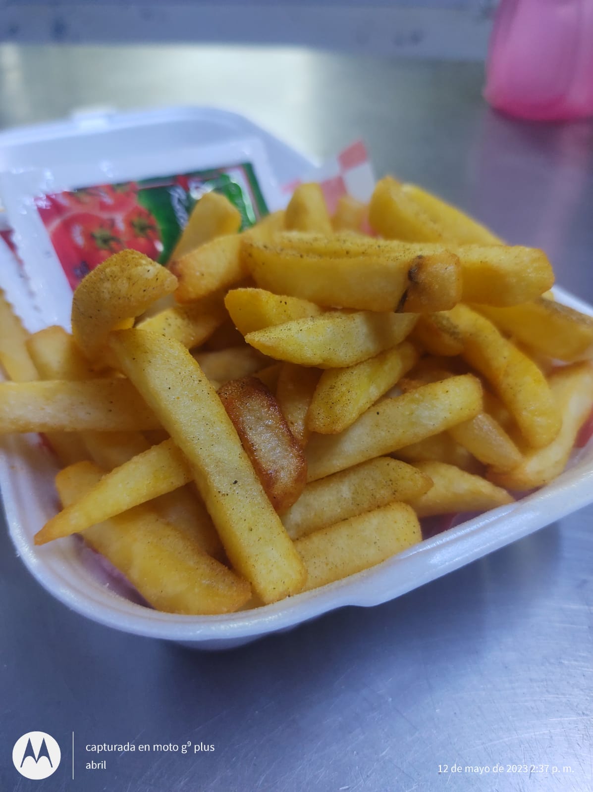 Hamburguesa Grande + Papas A la Francesa 100grs. aprox,Carne de pollo, queso amarillo, jamón, cebolla asada, chile toreado, lechuga, jitomate en bollo grande.