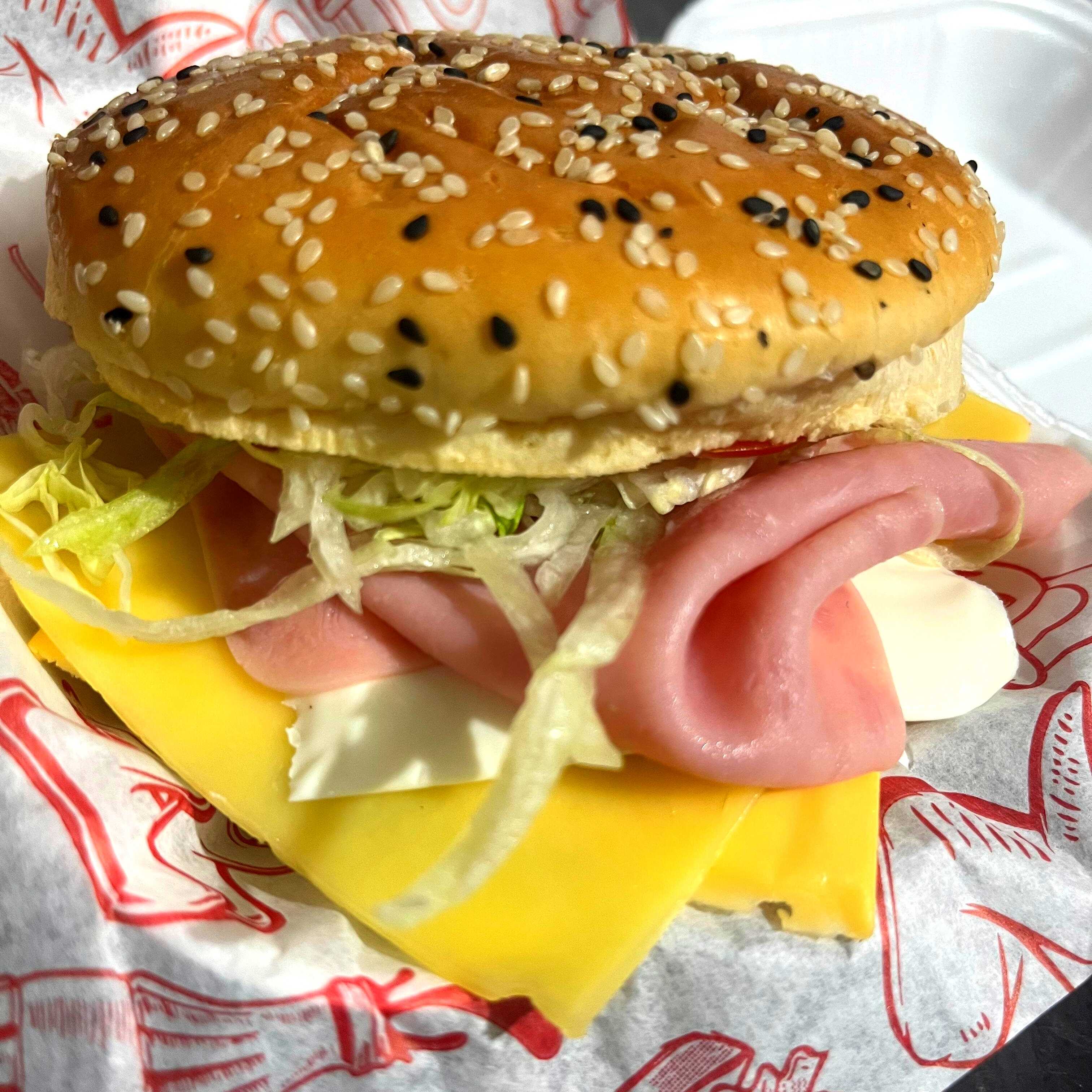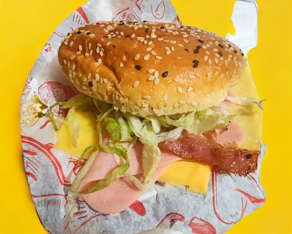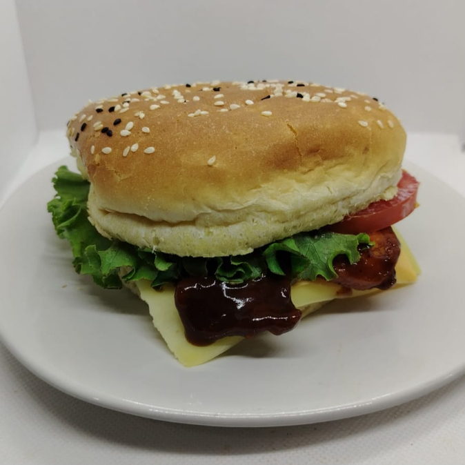 Hamburguesa elaborada con carne de resy jamón, con queso amarillo, manchego y queso crema, (jitomate, lechuga y cebolla caramelizada), aderezada con salsa de tomate y mostaza