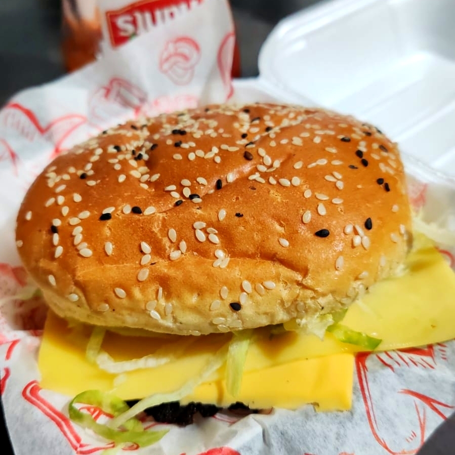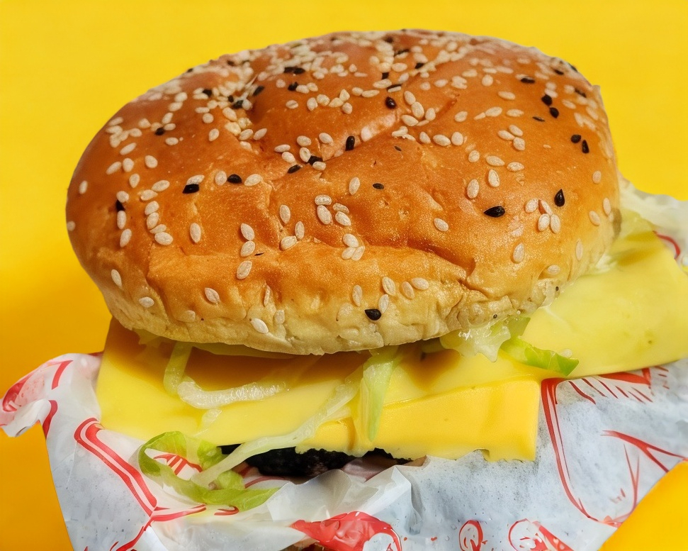Elaborada con carne de res, queso amarillo, queso manchego, (jitomate, lechuga, cebolla caramelizada) salsa de tomate y/o mostaza