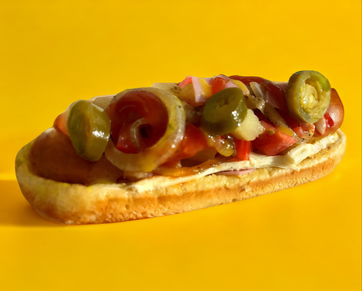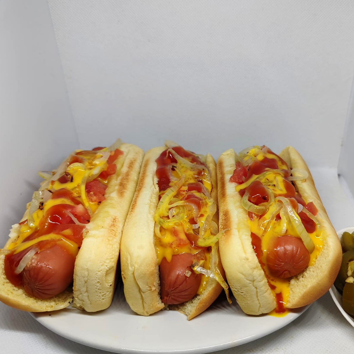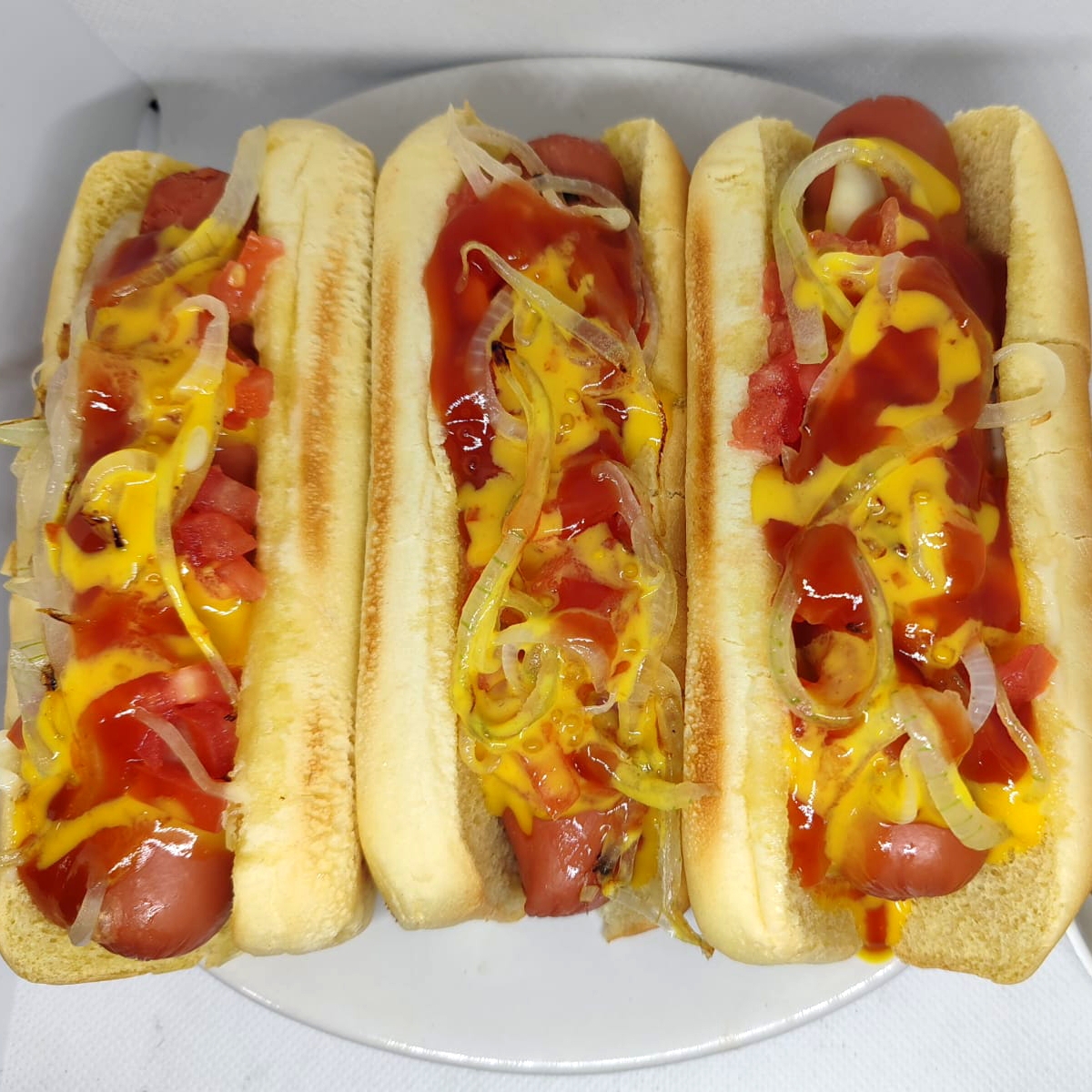 Salchicha De Pavo, Cebolla Caramelizada, Jitomate, Catsup Y Mostaza Miel