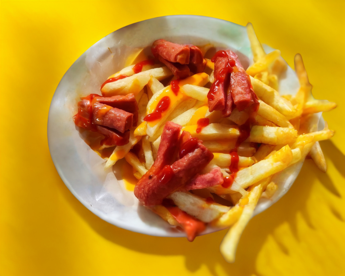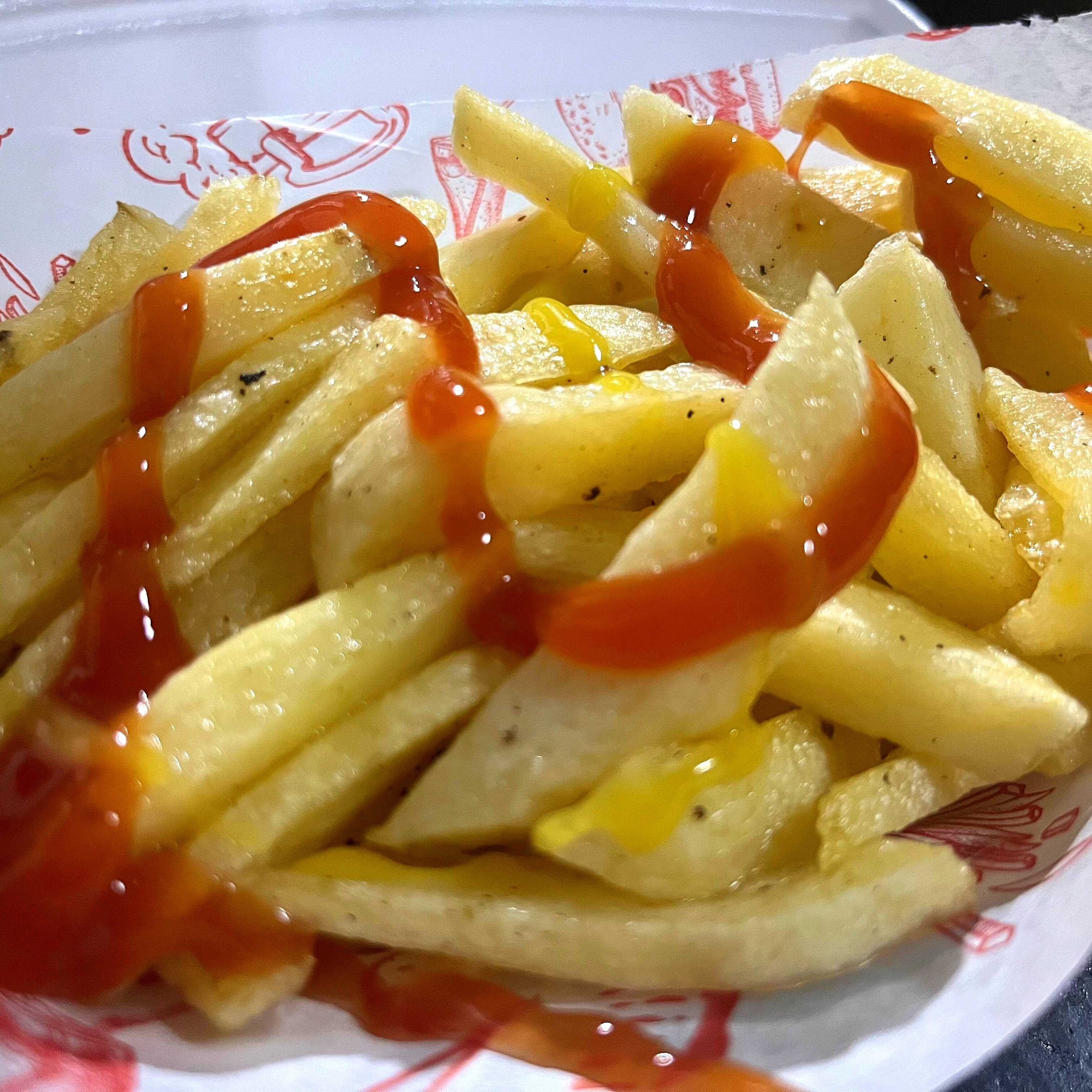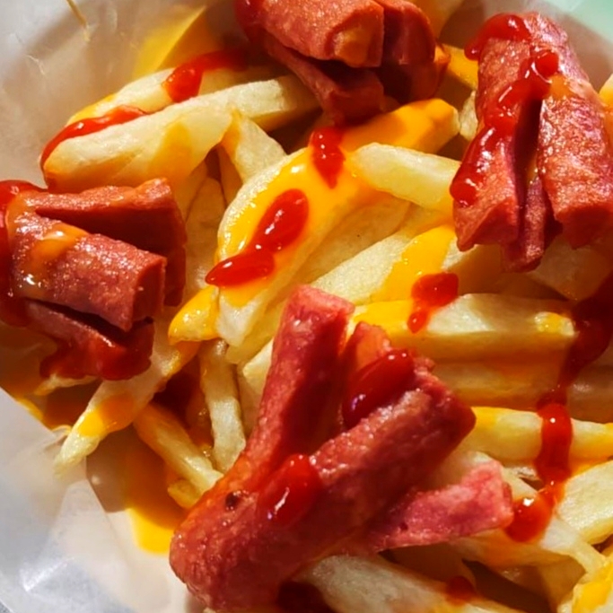 250 grs De papas fritas de manera tradicional acompañada de salchichas fritas, con aderezo de queso amarillo y/o catsup