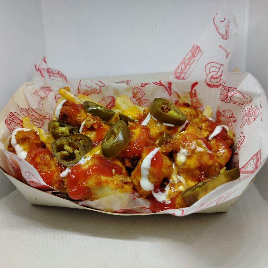 500g de papas con 250g de boneless (pechuga de pollo). Preparado en el momento, acompañado de Ranch, Salsa catchup y queso amarillo, también con la salsa de tu preferencia..