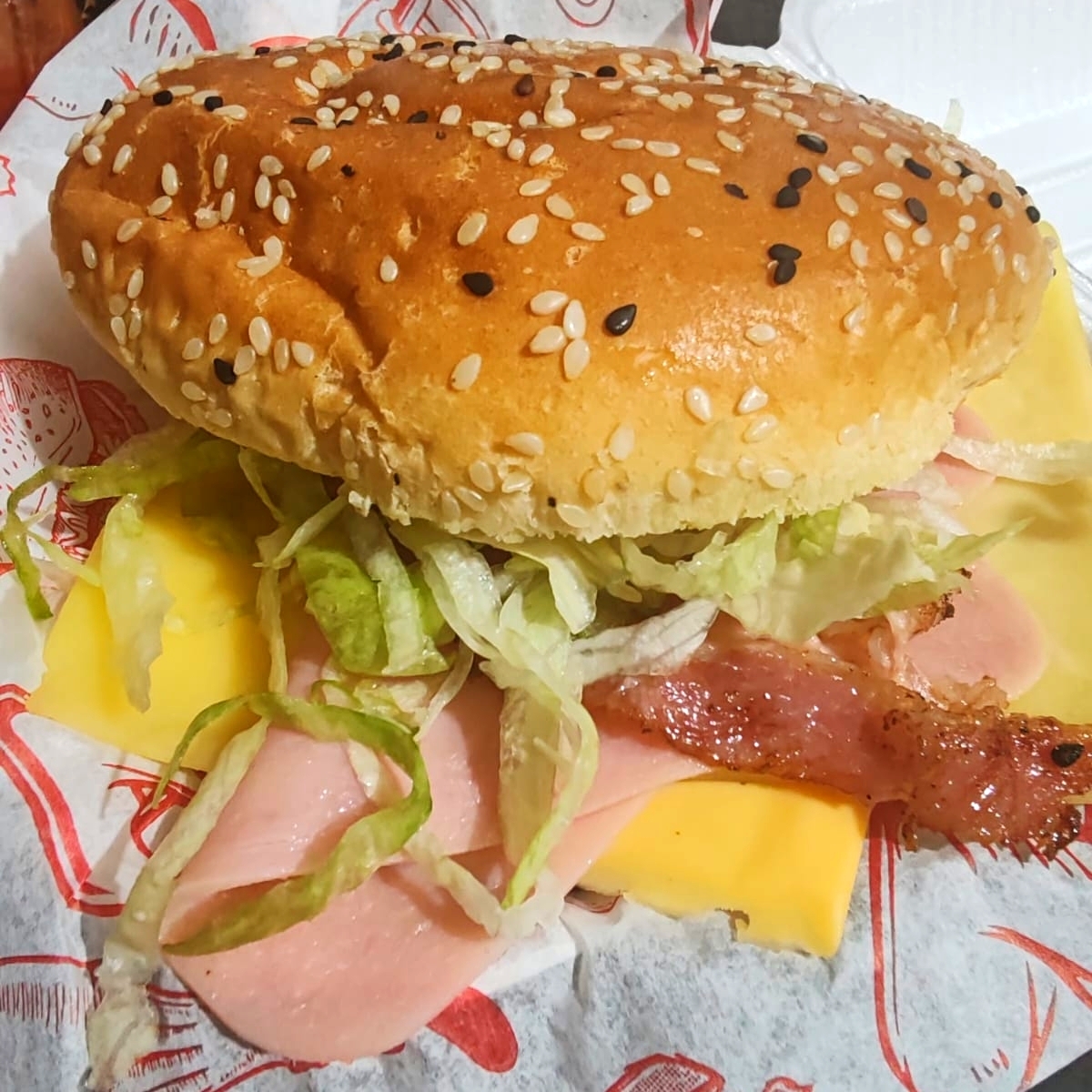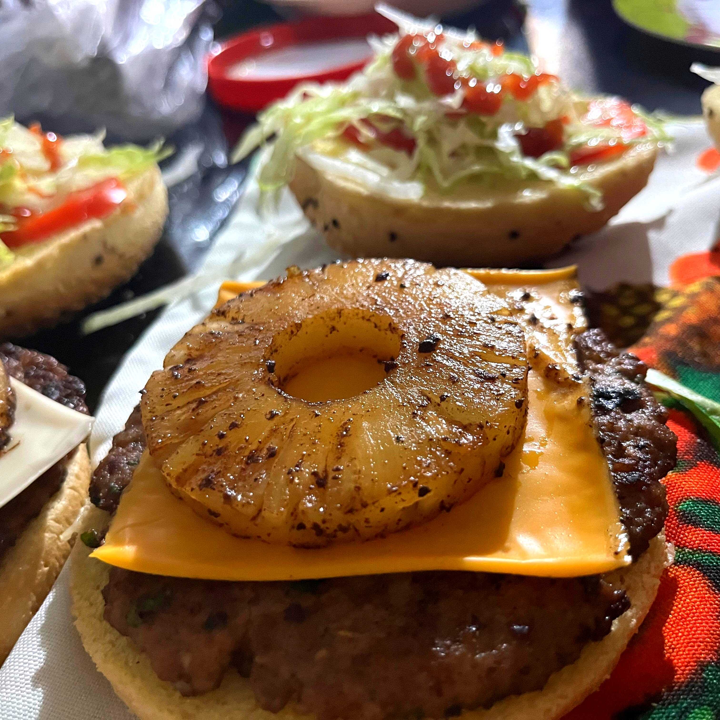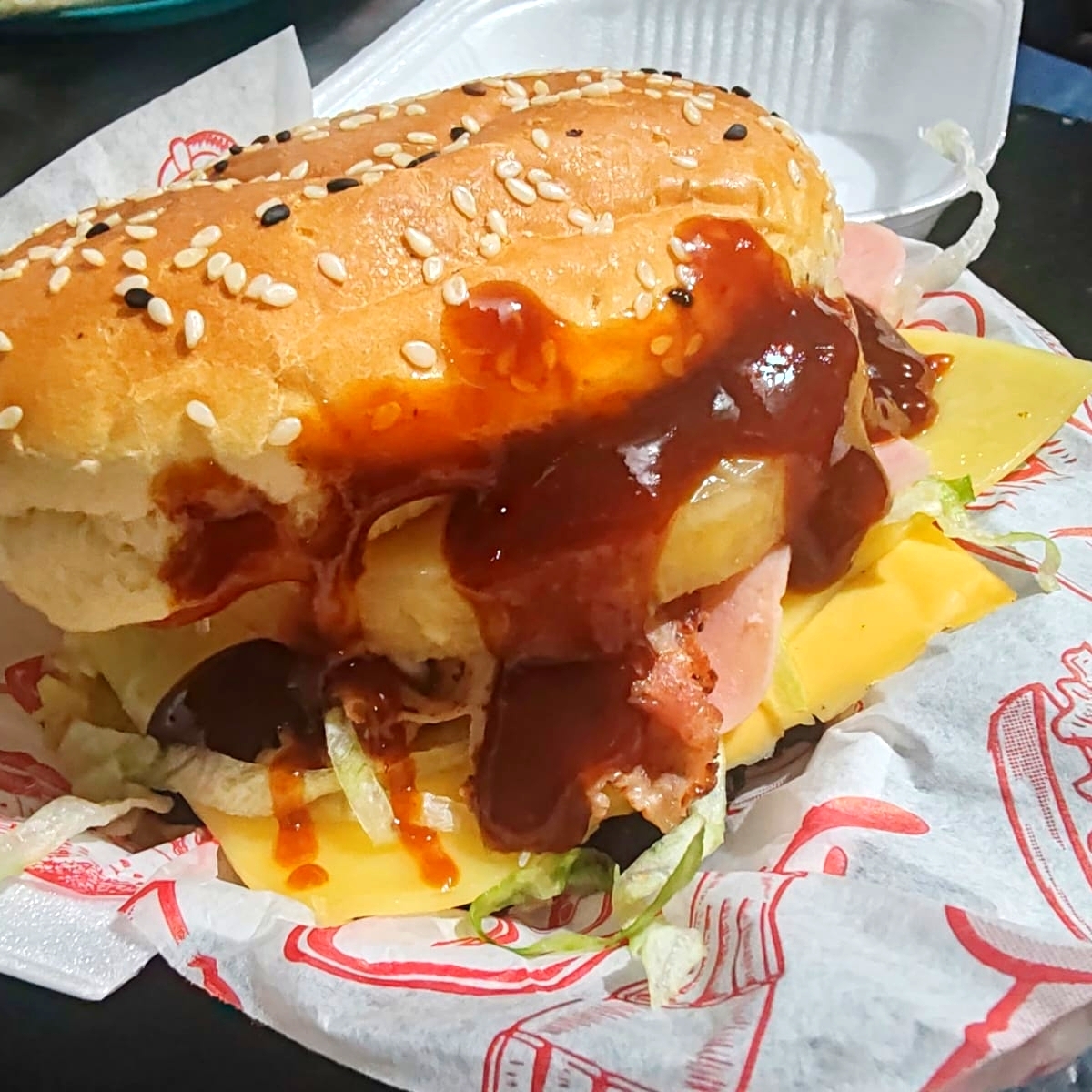 Elaborada con carne de res, jamón, queso amarillo, queso manchego, piña, (jitomate, lechuga, cebolla caramelizada) salsa de tomate y/o mostaza