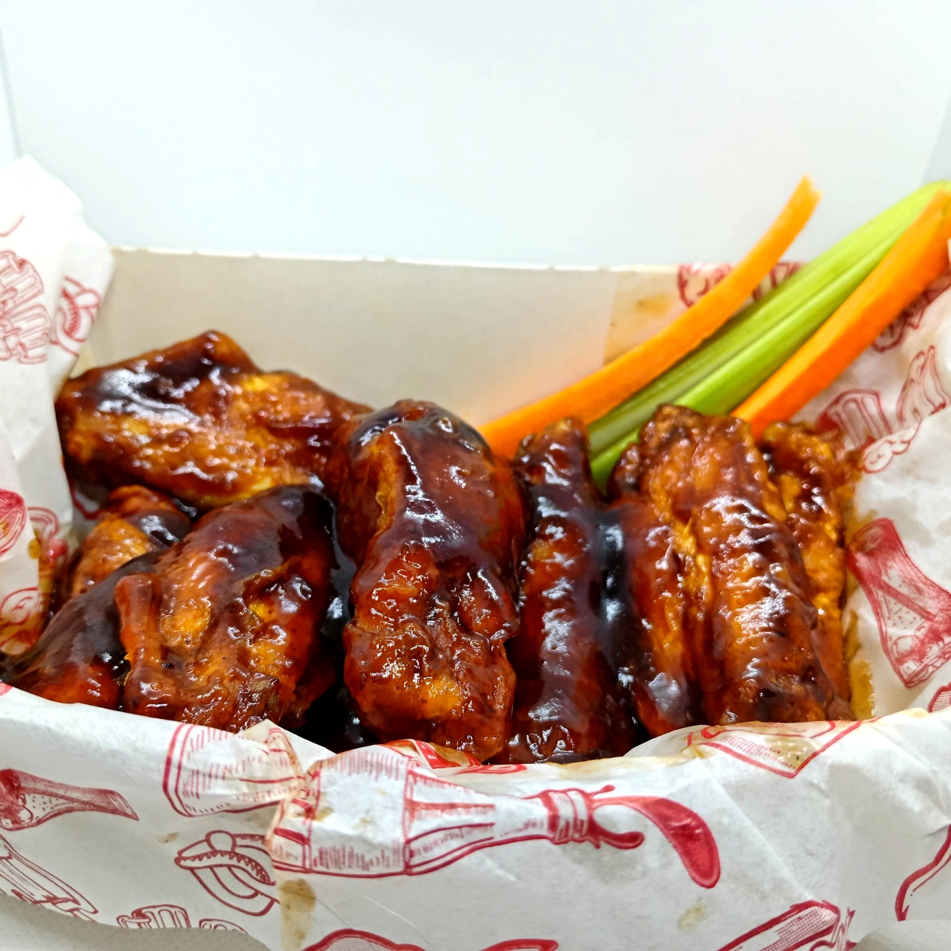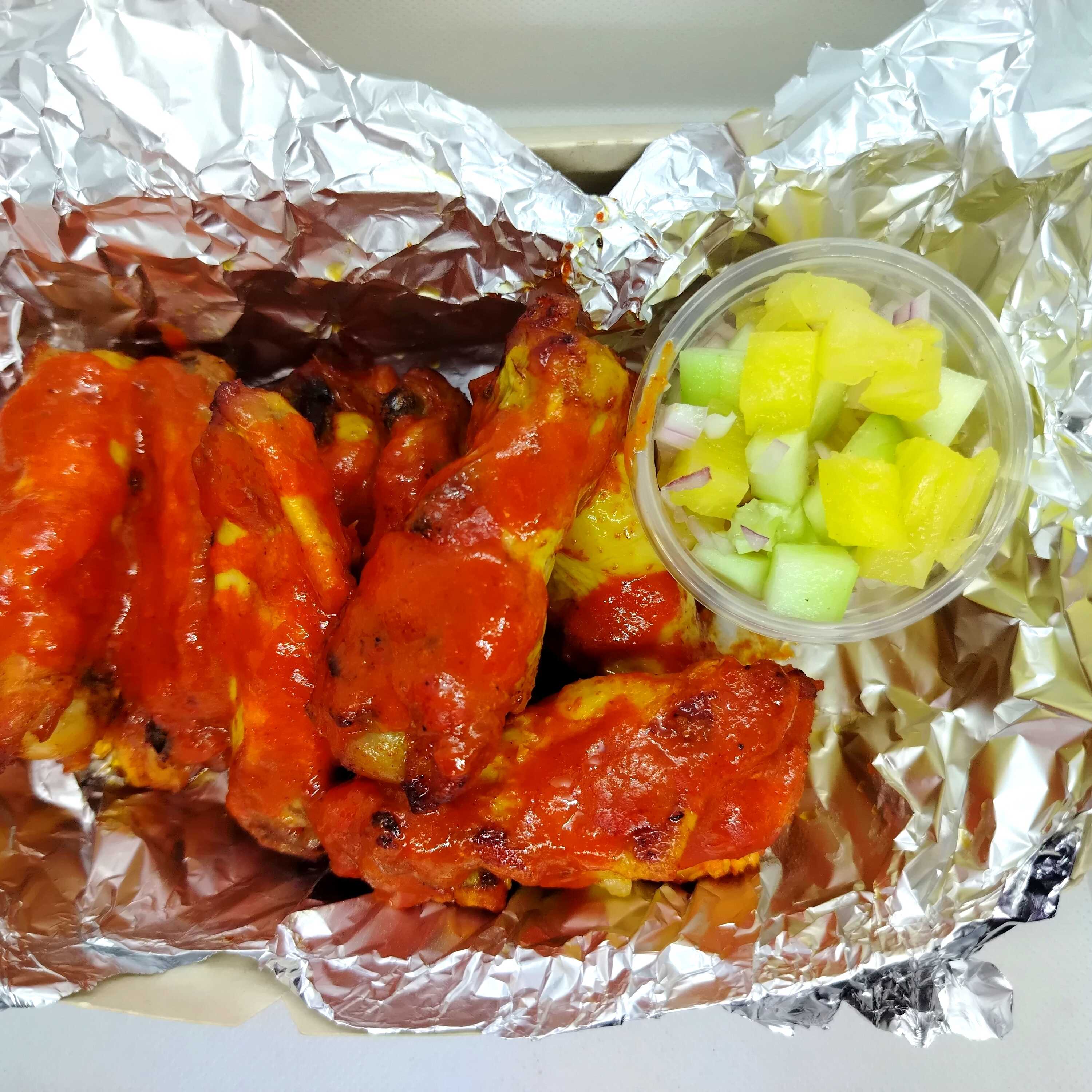 7 Alitas De Pollo Bañadas En La Salsa De Tu Preferencia. Indícanos si deseas que incluya aderezo Ranch o César. Incluye varitas de zanahoria y apio.