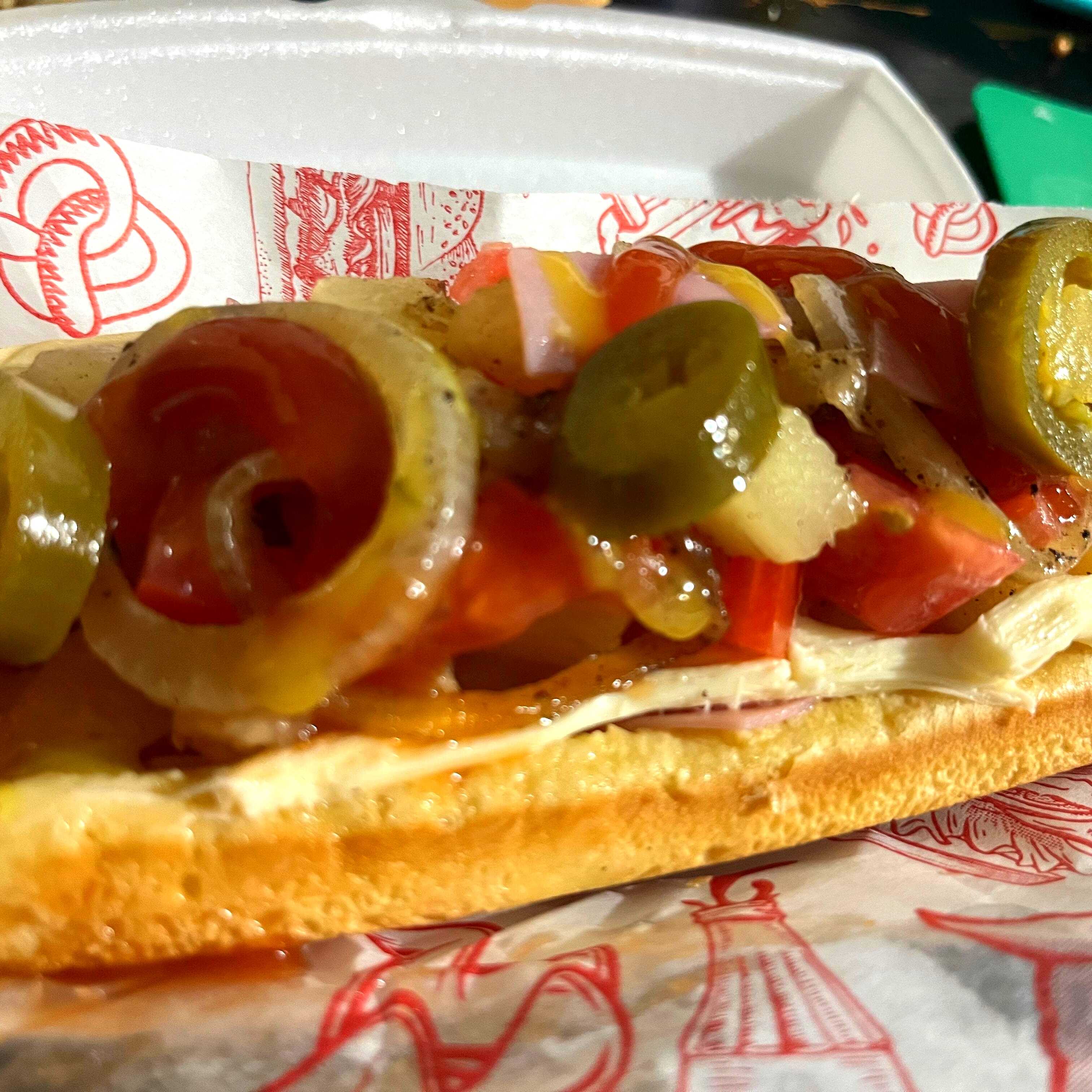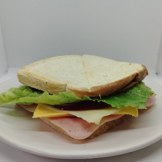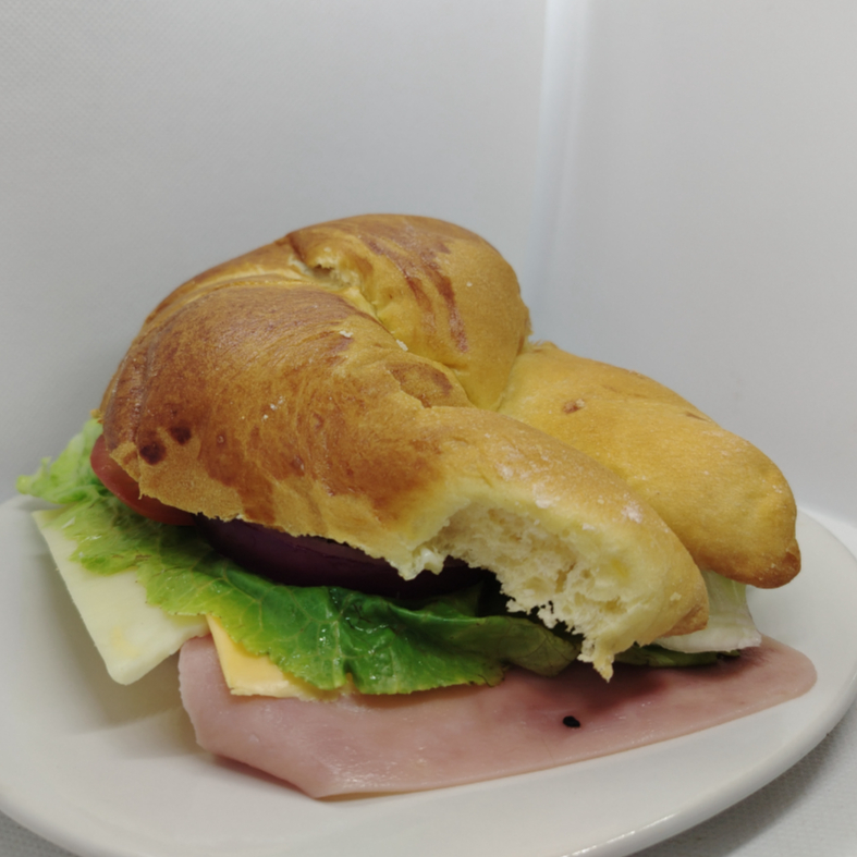 Cuernito relleno de queso amarillo, manchego y Jamón. Con lechuga, cebolla, aguacate y jitomate.
