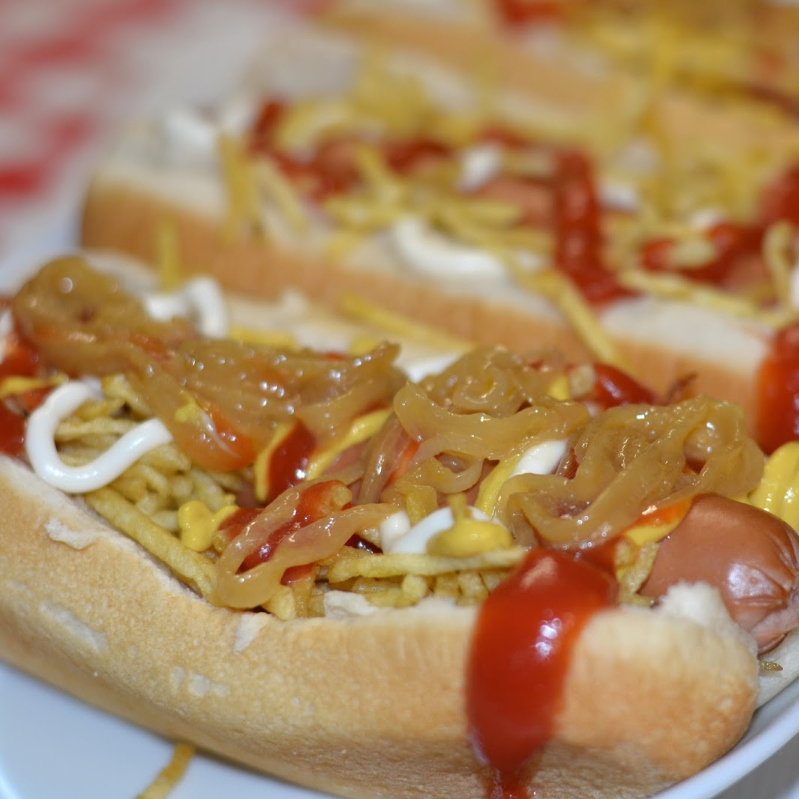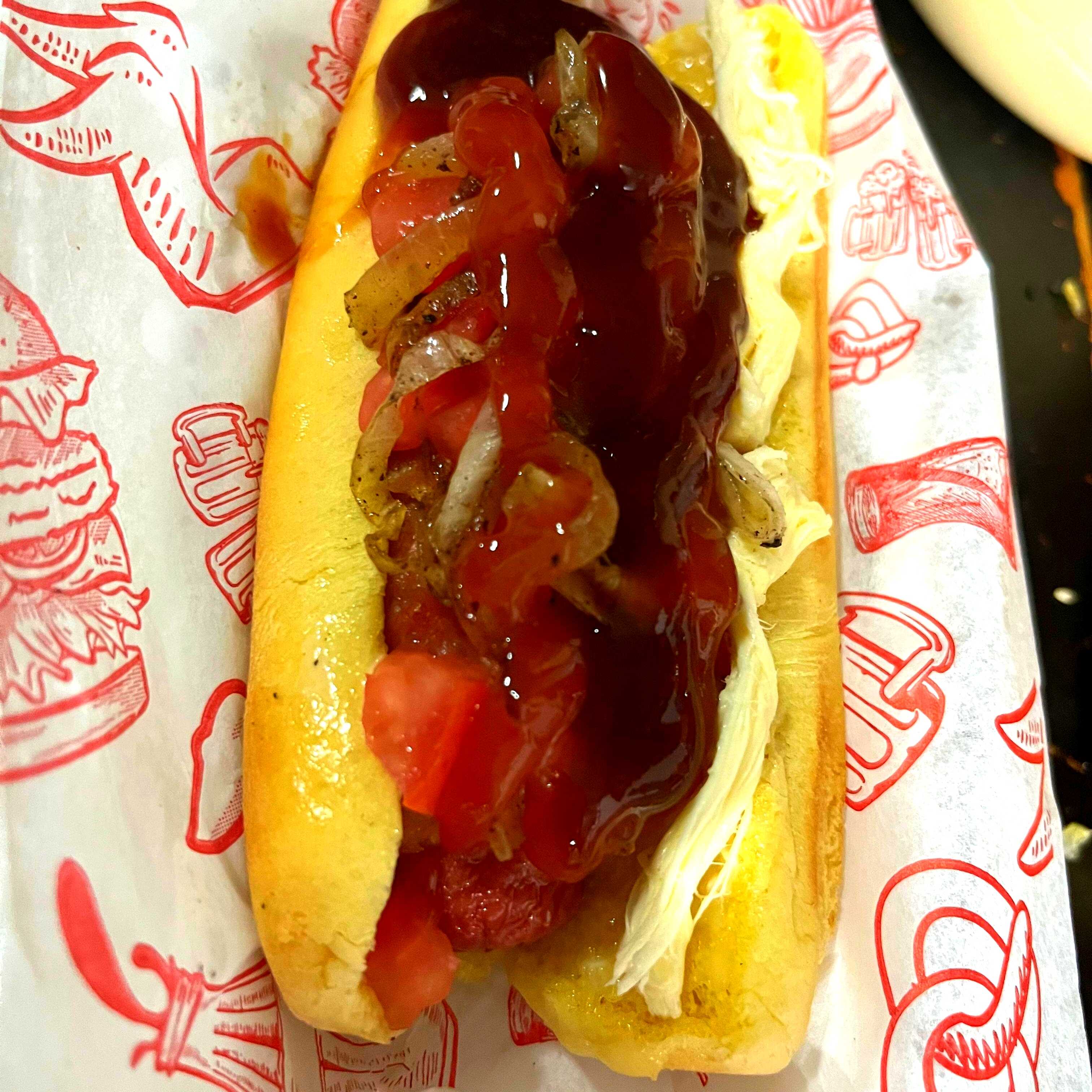 Salchicha Premium Rellena de Queso Manchego, envuelta en Tocino y bañado en salsa BBQ. Adicional: Piña Asada (Jitomate, Cebolla Caramelizada, Chile)Aderezos: Catsup y/o Mostaza