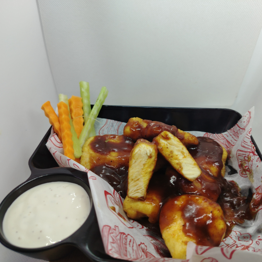 250g de Pechuga de Pollo (Aproximadamente 8 piezas). Bañadas con la salsa de tu preferencia. Acompañadas de palitos de Zanahoria, Apio y Aderezo Ranch. Preparados al momento.