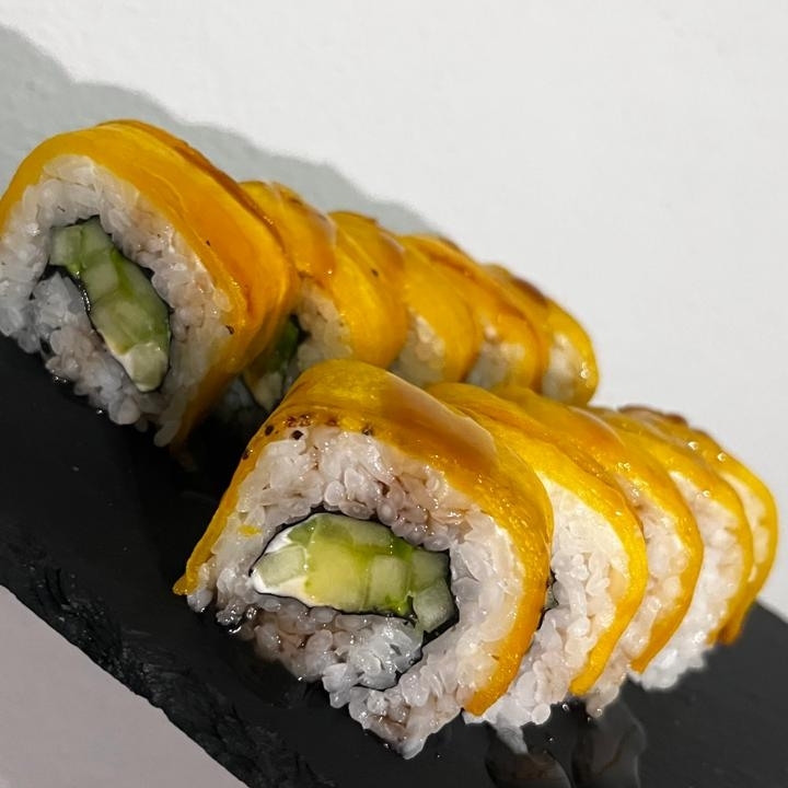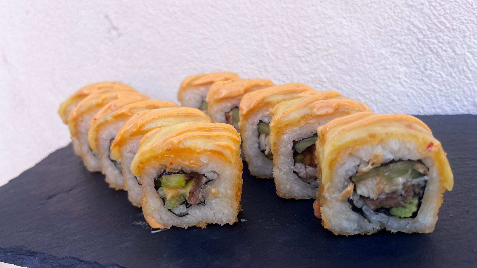 Por dentro (queso crema, pepino, aguacate, kakiage y queso manchego) por fuera (empanizado y rayado de aderezo chipotle).