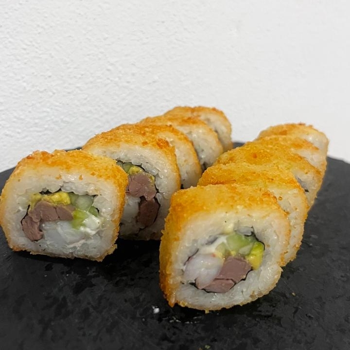 Por dentro: Queso crema, pepino, aguacate, kakiage, camarón empanizado. Por fuera: Empanizado, tampico en cada bocado y coronado con rodajas de camarón.