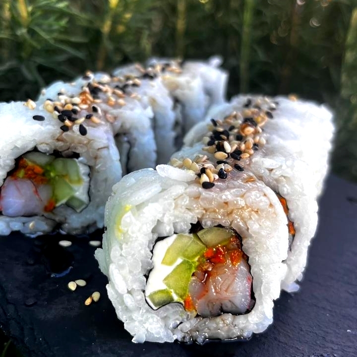 Por dentro (queso crema, pepino, aguacate, kakiage, camarón cocido y res).