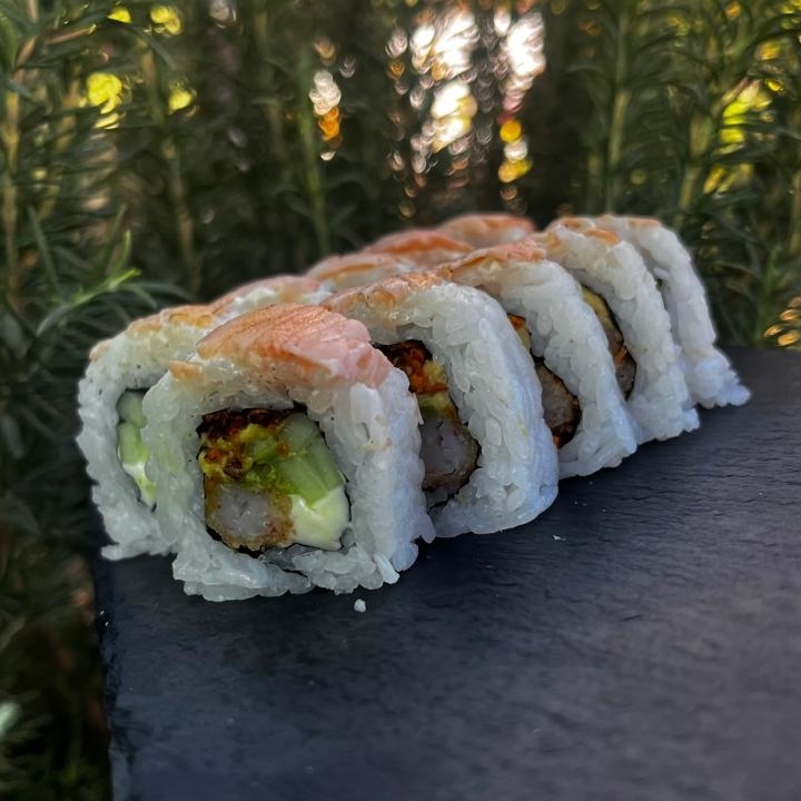 Por dentro( queso crema, pepino, aguacate, kakiage y salmón empanizado) por fuera (tampico en cada bocado).