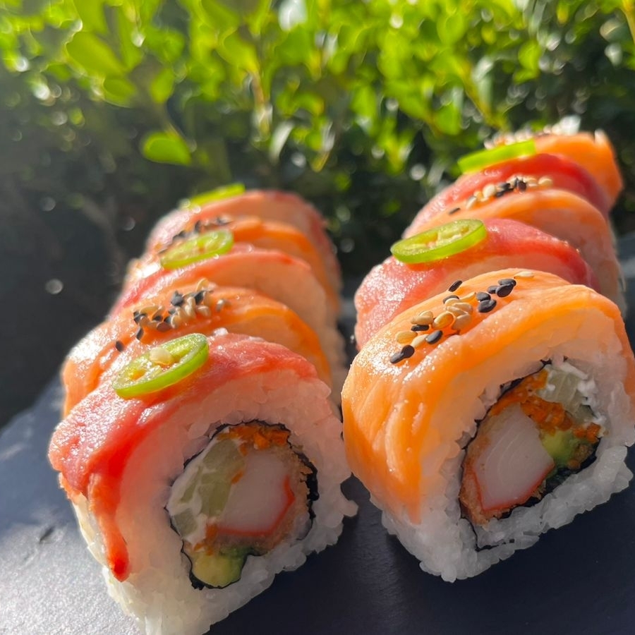 Por dentro (queso crema, pepino, aguacate, kakiage y camarón empanizado) por fuera (cubierto de atún y rodajas de serrano).