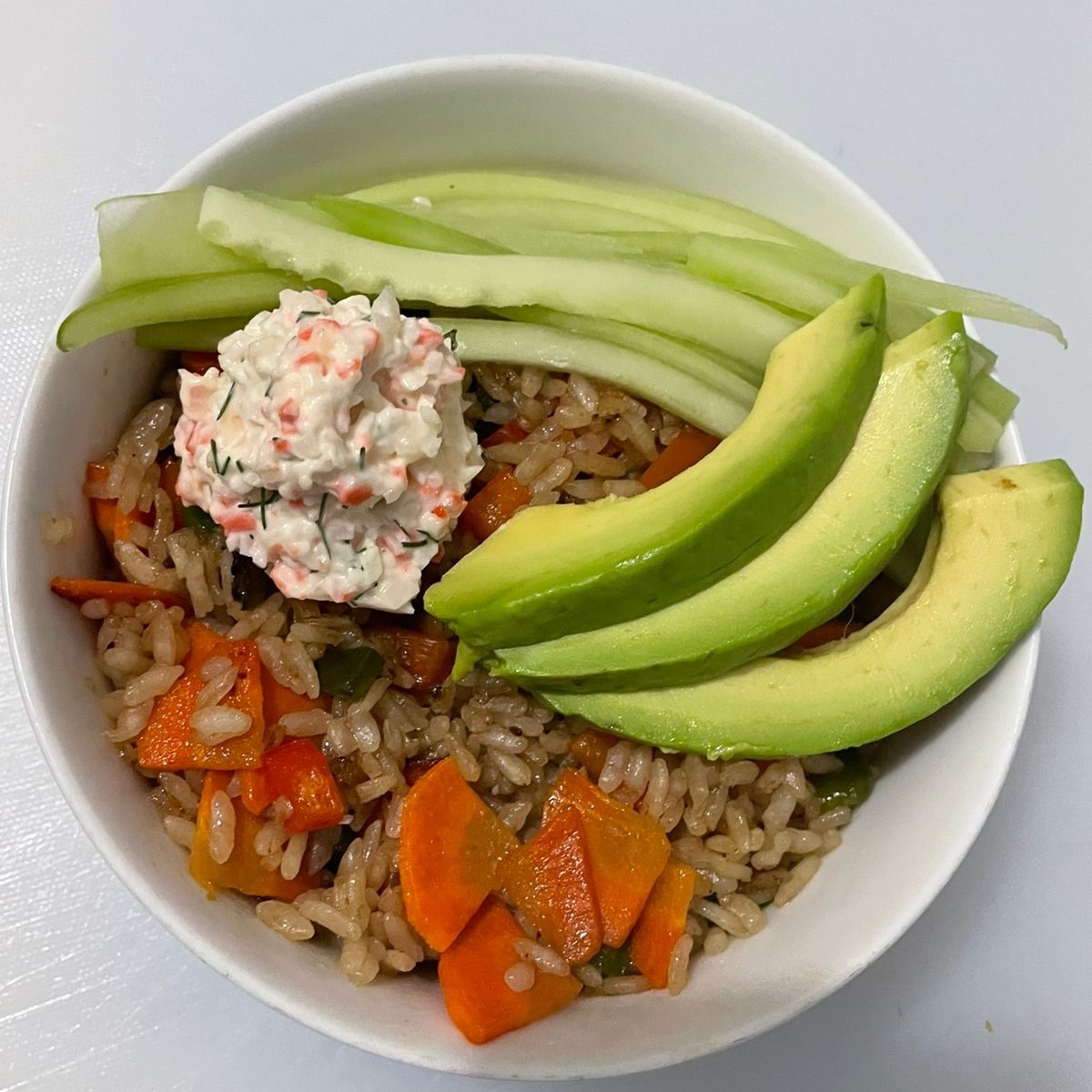 Delicioso arroz frito acompañado de verduras y decorado con tampico, abanico de aguacate y una proteína a elegir.