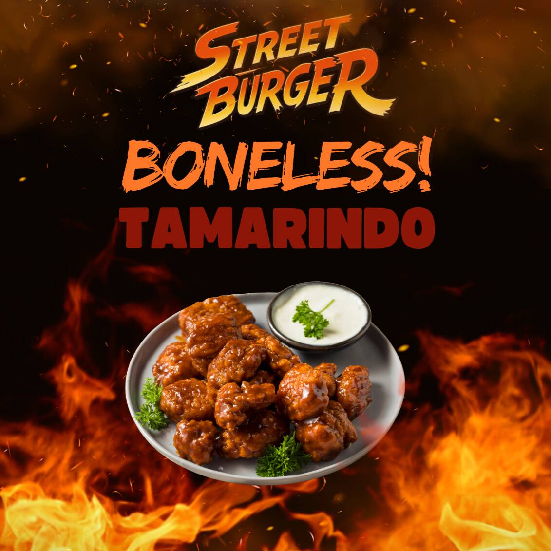 "Crujientes por fuera, jugosos por dentro. 250g de nuestros famosos boneless cubiertos en nuestra nueva y atrevida salsa de Tamarindo Picante. ¡Una combinación agridulce que te encantará!"