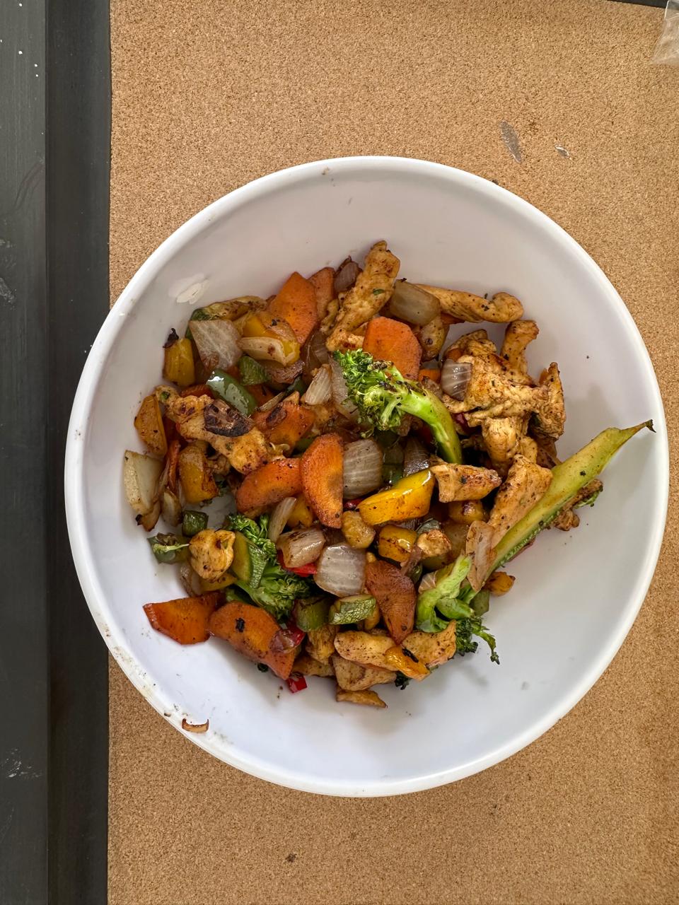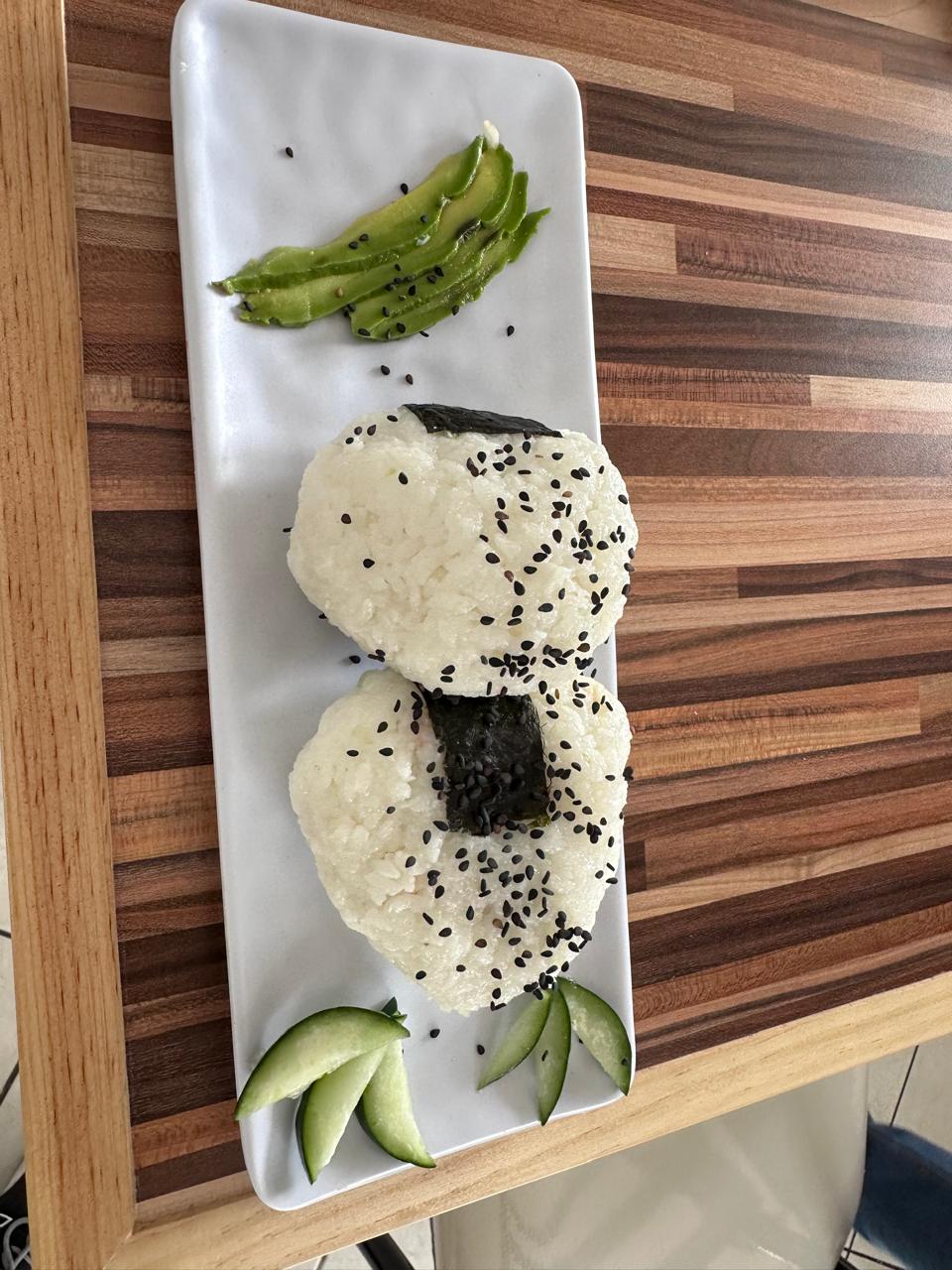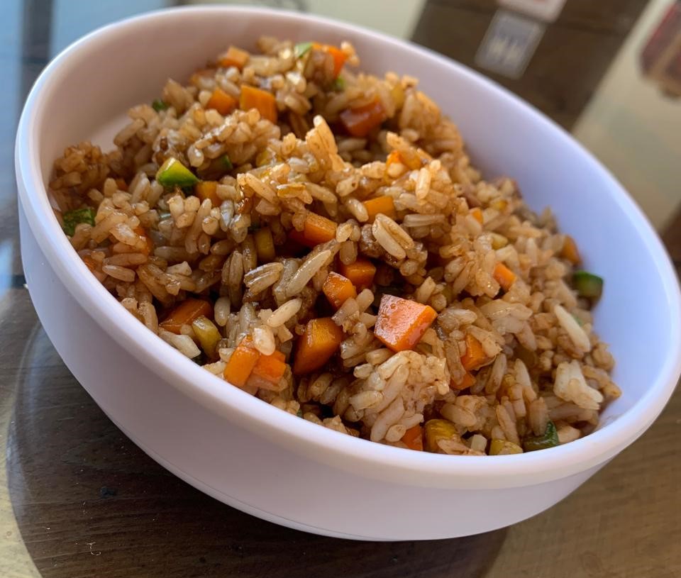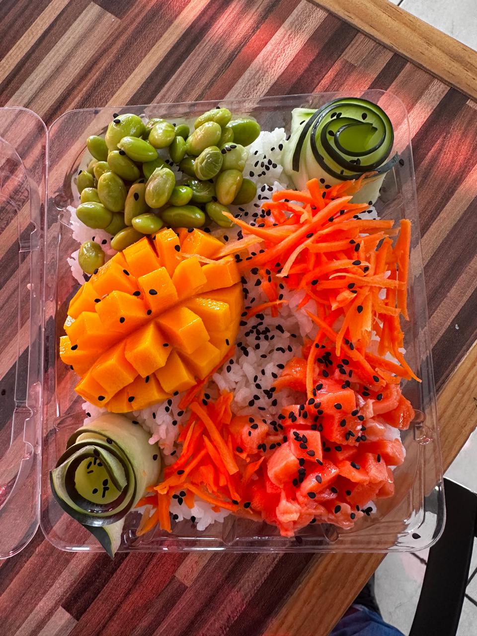 Arroz, edemames, zanahoria, pepino, queso crema, fruta de temporada alga, proteína a elección..