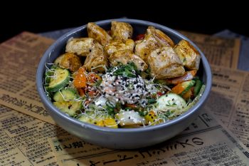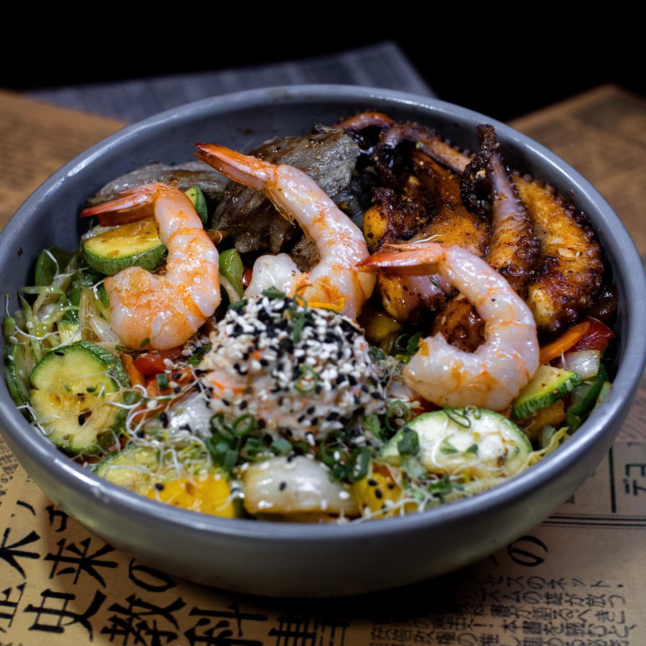 Tazón de arroz Japonés Sazonado con Salsa Secreta a la Plancha, Acompañado con Verdura Mixta Y Tampico al centro.