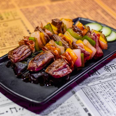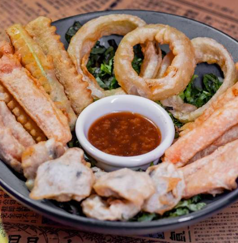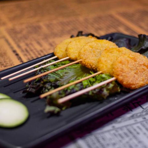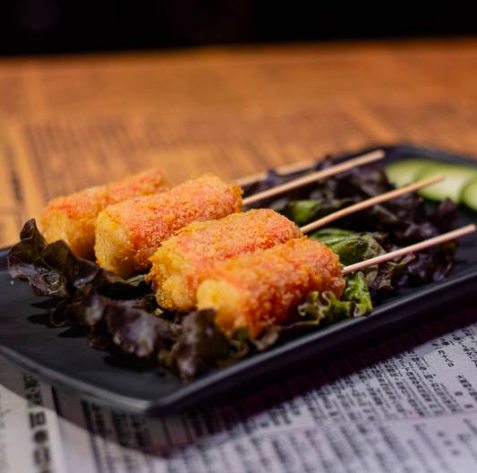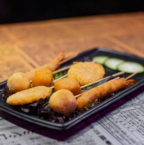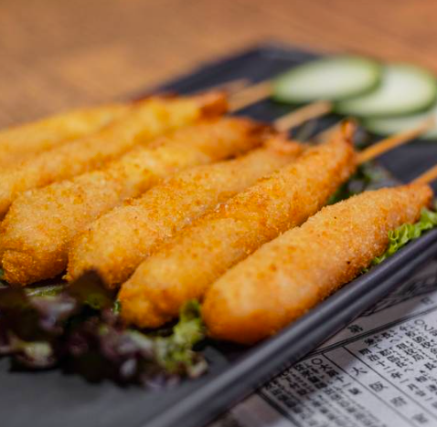 2 Brochetas Kushiagues de Plátano, 2 Brochetas Kushiague Manchego, 2 Brochetas Kushiage de Philadelphia, 2 Brochetas de Kushiague de Camarón.
