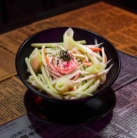 Ensalada a base de Pepino y Cangrejo, acompañada de Tampico al centro y Furikake.