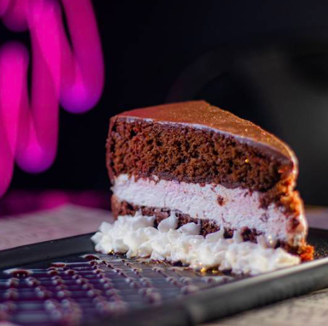 Bizcocho Suave de Chocolate turin semi amargo, con crema Lyncott®, crema de chocolate y cereza.