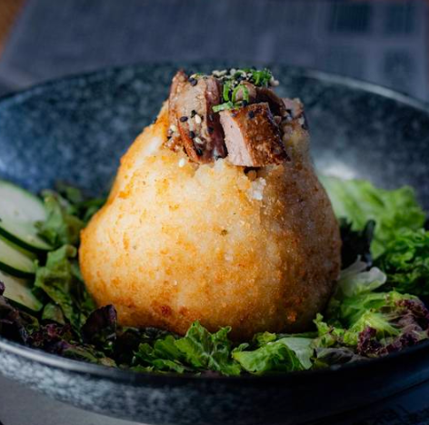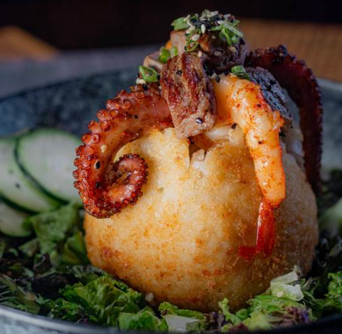 Bola de arroz empanizada con Panko Japones, rellena de Arrachera, Pulpo y Camaron , Cebollín, Queso Manchego, Queso Philadephia, Tampico, Aguacate y Chipotle, Acompañado de Salsa de Soya y Anguila.