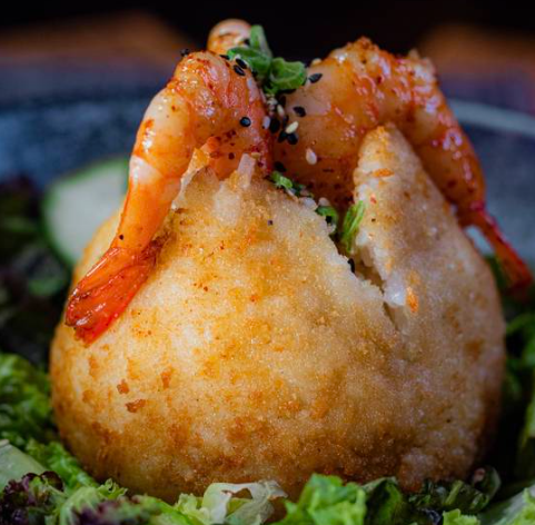 Bola de arroz empanizada con Panko Japones, rellena de Camaron, Cebollín, Queso Manchego, Queso Philadephia, Tampico, Aguacate y Chipotle, Acompañado de Salsa de Soya y Anguila.