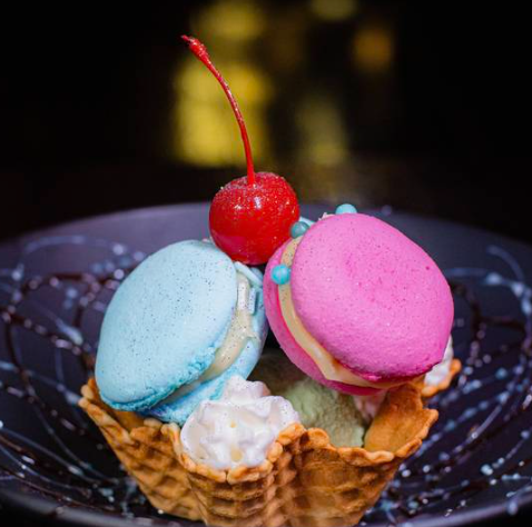 3 Macarrones Rellenos de Crema Francesa y Chocolate blanco. Sobre una bola de Helado de Pistache Artesanal. Una Deliciosa Elección.