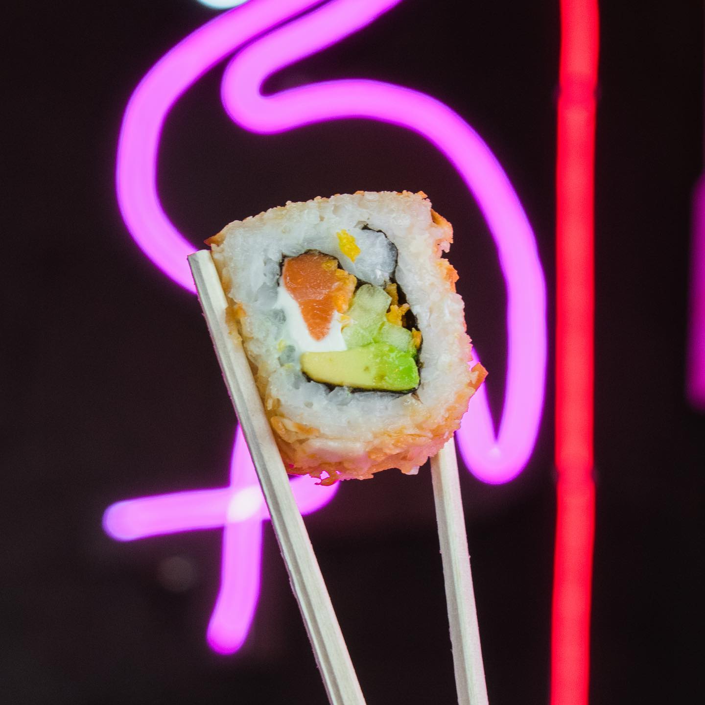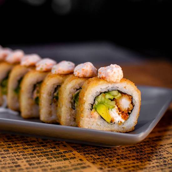 Por fuera empanizado con Panko Japonés y Aderezo Chipotle. Por dentro Aguacate, Pepino, Zanahoria y Queso Philadelphia.