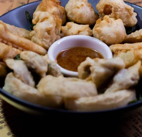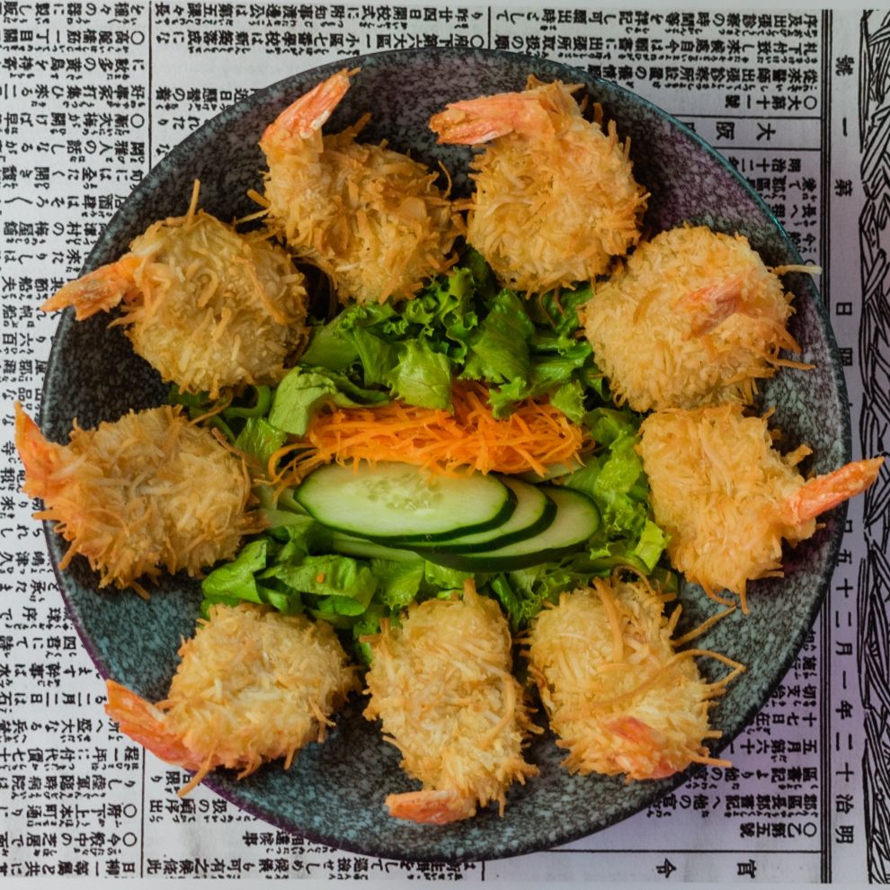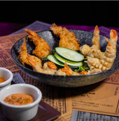 Delicioso Mix de Camarones Gigantes. 3 Camarones Kokonatsu, 3 Camarones Rokka, 3 Camarones Mushu. Acompañados de Aderezo Chipotle y Aderezo de Mango Habanero.