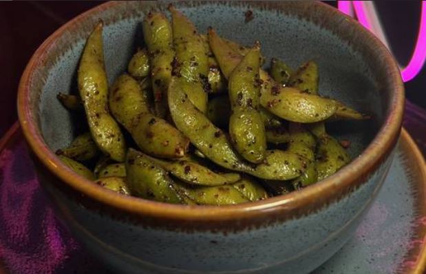 Edamames de Dragon, Preparados con Sal del Himalaya, Bañados en un Mix de Salsa Dragón, Chile Piquín, Hierbas Finas, Soya, se recomienda acompañarlos son Salsa Dulce de Anguila.