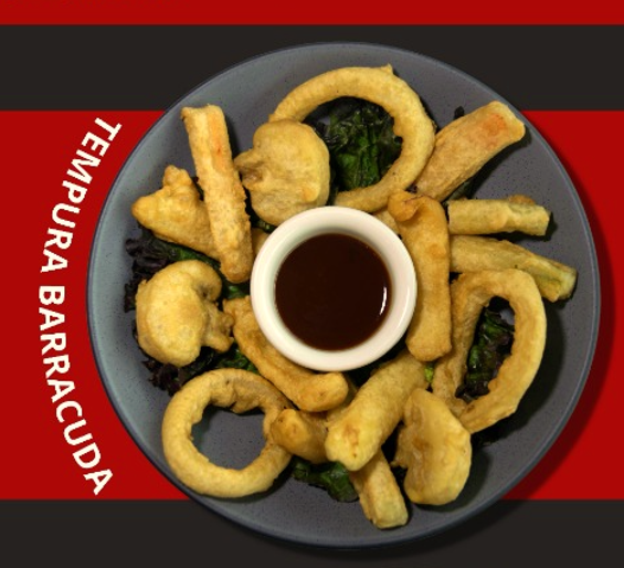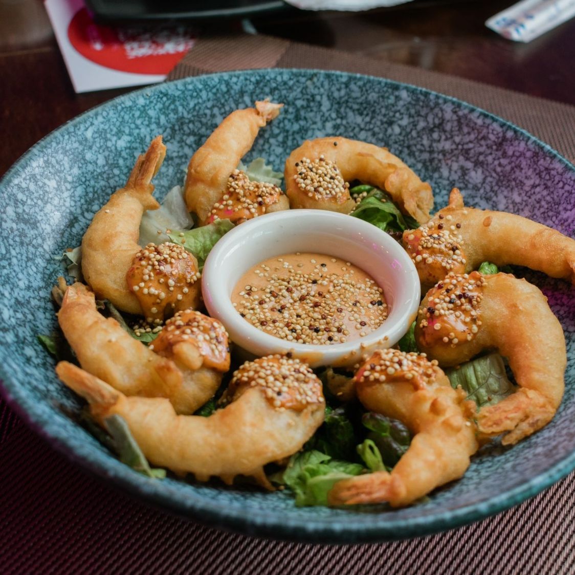 9 piezas de Camarones Gigantes preparados al Tempura Japonés, bañado en Aderezo Chipotle y Soya Virgen, acompañado de Quinoa Crocante sobre una cama de Lechuga Fresca importada.