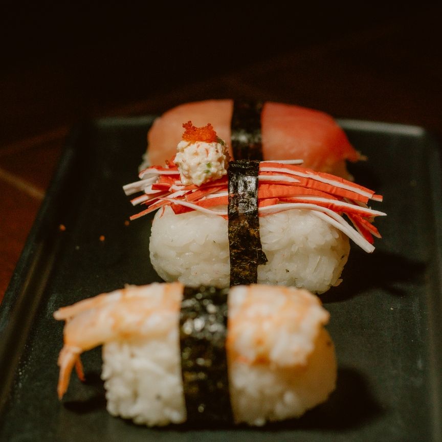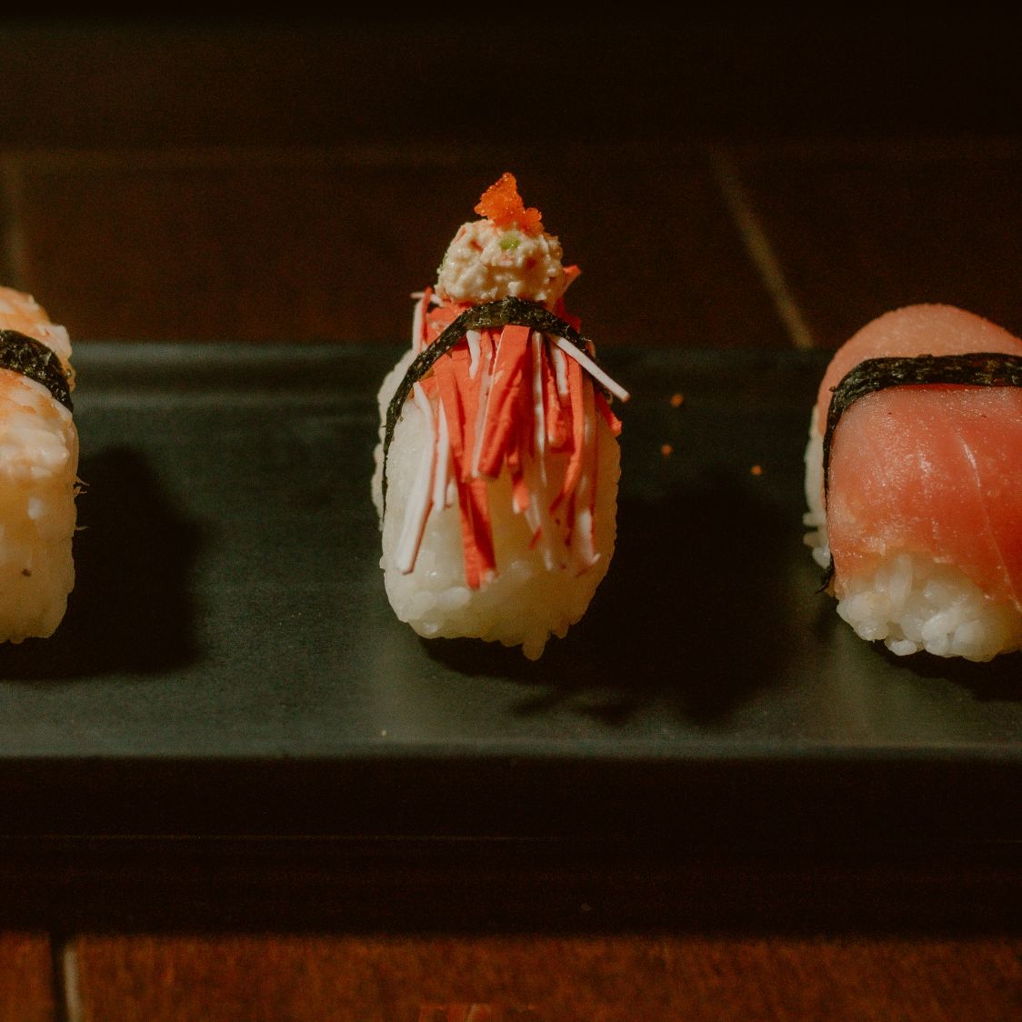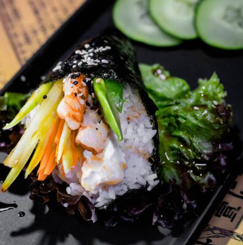 Por fuera Nori, AderezoChipotle, Tampico, Ajonjoli, Cebollin y Salsa Mango-Habanero, por dentro Camarón Empanizado, Arrachera, Manchego y Queso Philadelphia.