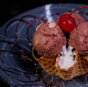 Plátanos Machos Fritos, Cubierto de Dulce Lechera y Chocolate Hersey, Helado de Vainilla y Canela.