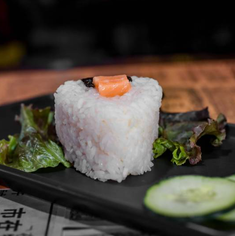 Por dentro delicioso Salmón, Queso Philadelphia, Zanahoria y queso manchego,. Por fuera Ajonjoli tostado y Philadelphia