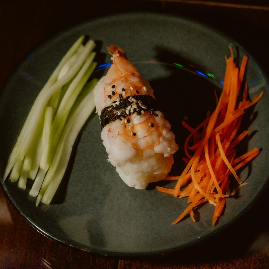 Por fuera Queso Oaxaca, Salsa Sriracha y Cebollín, por dentro Camarón Empanizado, Esparrago, Zanahoria, Pepino, Aguacate y Queso Philadelphia.