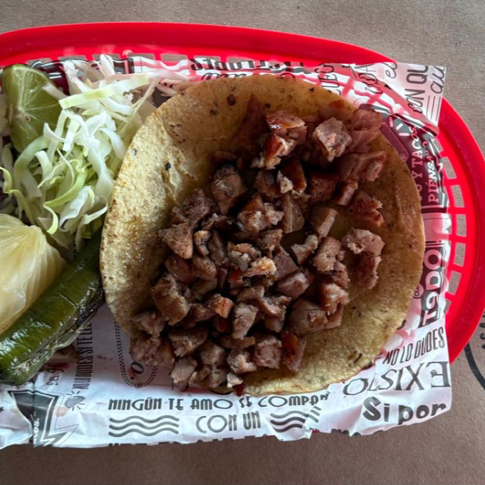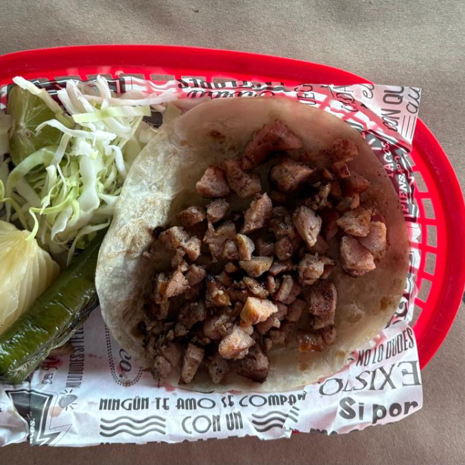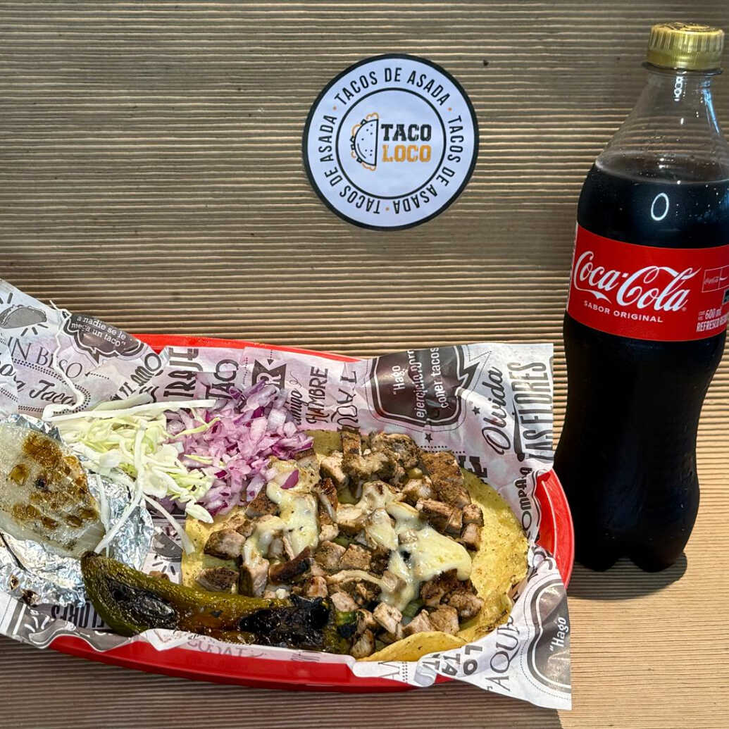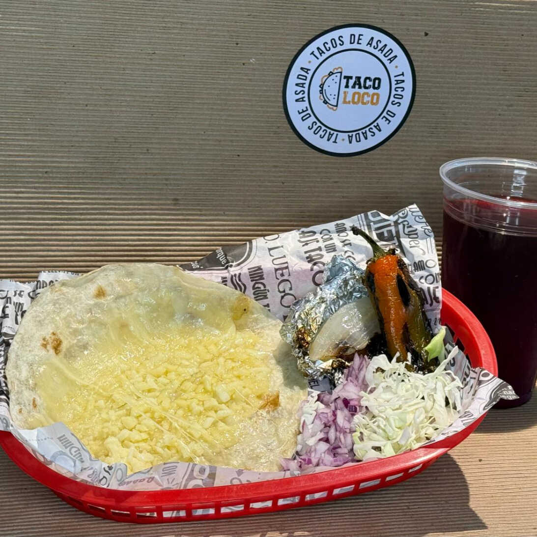Taco de asada al carbon, con queso en tortilla de maíz nixtamal.