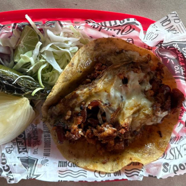 DELICIOSO TACO DE CHORIZO ESPAÑOL ASADO AL CARBON CON UNA MEZCLA DE QUESO OAXACA Y MANCHEGO EN TORTILLA DE MAIZ NIXTAMAL
