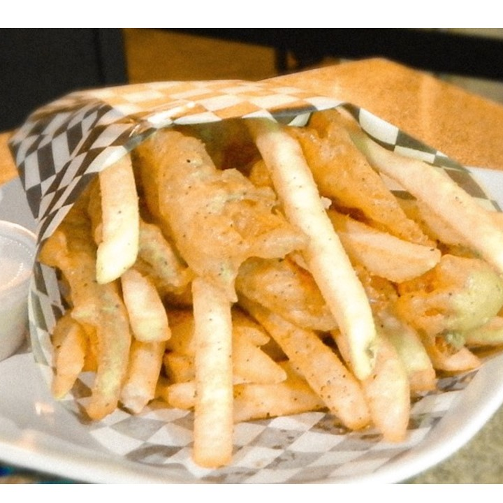 Riquísimas tiras de pescado acompañadas de papas a la francesa.