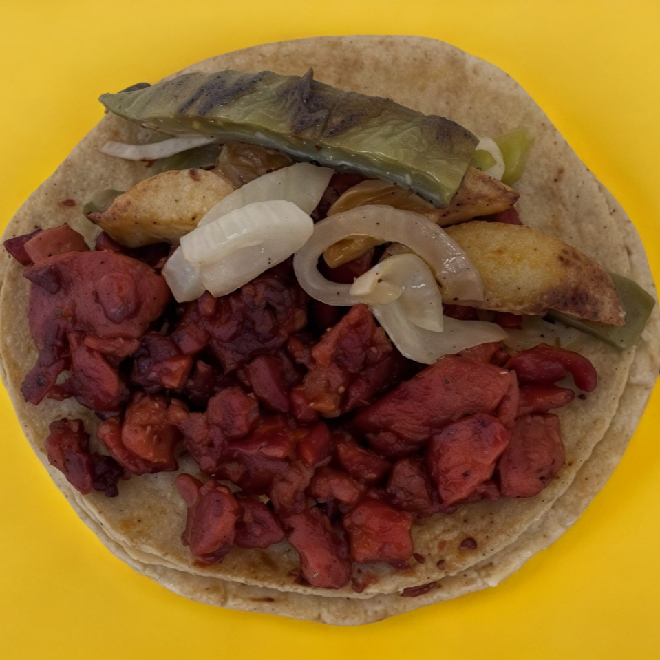 Tortilla de maiz, chorizo rojo, papa, nopal, cebolla