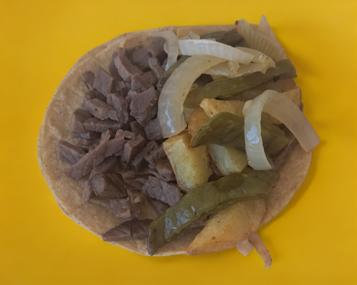 Tortilla de maiz, bisteck, papa, nopal y cebolla